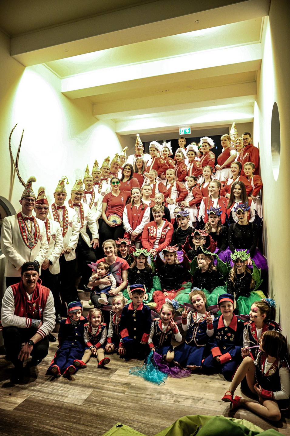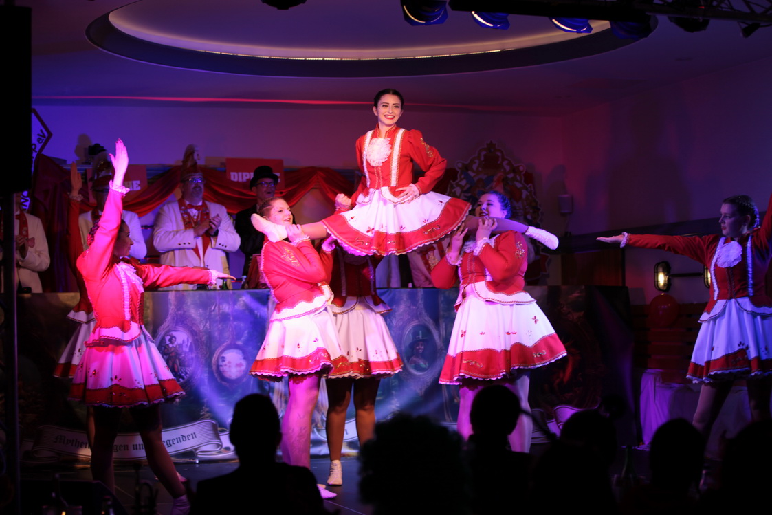 Nach der Pause eroberten Fussballlegenden den Saal und stellten tänzerisch das Wunder von Bern dar. Vor allem mit ihrer Zugabe sorgte der Elferratstanz für ausgelassene Stimmung im Saal. Nun wurde es mal wieder Zeit für einen weiblichen Ausgleich. Als Auszubildende in einem „Männerjob“ hatte Amelie Hachmer viele Anekdoten zu berichten. Die Duomariechen, Maike Hachmer und Michelle Kreuz brillierten gewohnt mit ihrem fantastischen Auftritt. Den Abschluss der eigenwilligen Abstinenzler-Versionen bildeten die Knorr Girls, eine nicht ganz mädchenhafte Girlband. Die Parodie ist auch eine Form der Anerkennung und diese zollte Elias Werner nun als Norman Reyer in Perfektion. Eingetaucht in die Schlagerwelt brachte er die Stimmung auf Höchstwerte. Als letzter Redner des Abends berichtete Jürgen Engels nun aus dem Alltag des Bopparder Ordnungsamts. Doch ganz ohne „Rehlein“ ging es auch dieses Jahr nicht. Im Anschluss wurde es wieder legendär. Das Männerballett brachte dem jubelnden Publikum seine Sicht der Loreleysage nahe. Nun eroberte Megabrass die Bühne und sorgte in gewohnter Weise für ausgelassene Stimmung. Das Showballett entführte als letzter Tanz das Publikum ins mythische Irland. Wie immer eine fantastische Choreographie die die Narren begeisterte. Mit einem farbenfrohen Finale und dem gemeinsamen Singen des Abstinenzlerlieds endete eine in jeglicher Hinsicht legendäre Knorrköpp Sitzung.